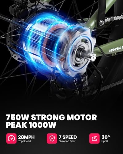 VELOWAVE Electric Bike for Adults 750W BAFANG Motor 28MPH Mountain Ebike 48V 15Ah Removable LG Cells Battery 26” Fat Tire E Bike Shimano 7-Speed