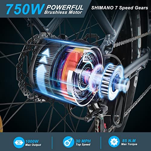 26″ Fat Tire Electric Bike 48V 17.5Ah Battery, 750W Mountain Electric Bicycle City Urban Commuter E Bike for Adults Men Women Long Range 30MPH 7-Speed Gears Color Dispaly with 2 Seat