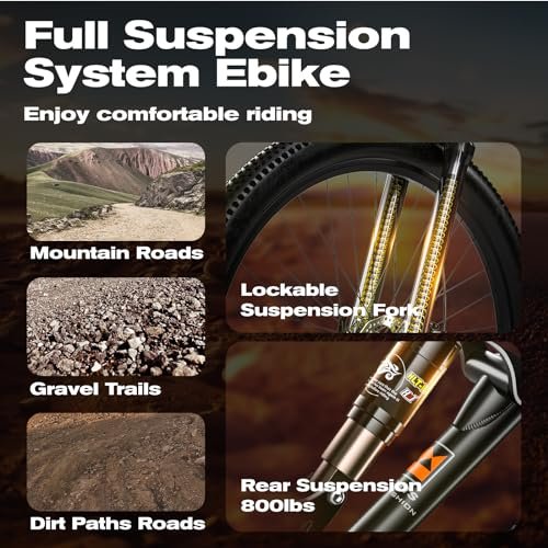 | Special Feature | 1)Full Suspension System: Lockable and Adjustable Front Suspension Fork + 800lbs Rear Suspension. 2) Special Frame Design. 3)Digital LCD Display. 4)Phone holder with 5V USB Charge. 5)Bright Headlight. 6) Adjustable Seat. 7)Thumb Throttle. 8) Dual Disc Brake and 7 Speed Gear1)Full Suspension System: Lockable and Adjustable Front Suspension Fork + 80… See more |