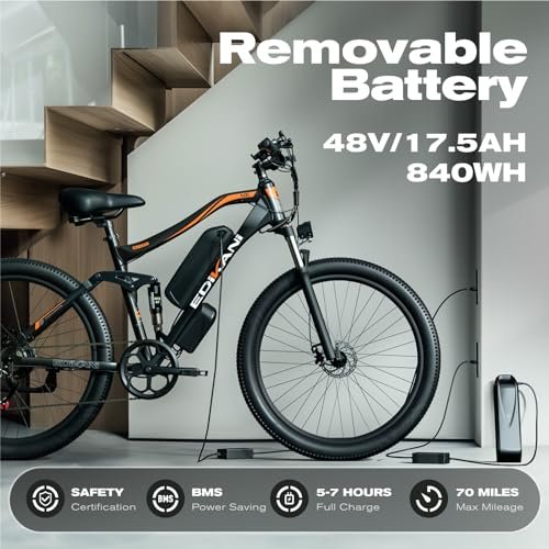 27.5″ Electric Bike for Adults, Peak 1000W 32Mph Electric Mountain Bike with 17.5Ah 48V Battery, 70 Miles Electric Bicycle with 7 Speed Gears, Full Suspension System Ebike for Commuter