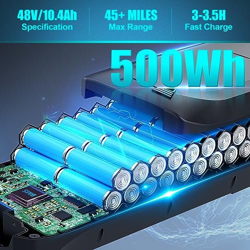 - Extended range battery. : – 48V 10.4Ah removable battery with a fast 3A charger. Full charge in about 3–3.5 hours and up to 60 miles per charge.