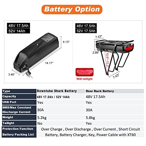 Battery (optional)– Shark Battery with Charger ( Bike Frame/Downtube Battery ). : – 48V 13Ah/17.5Ah/20Ah