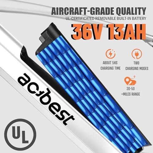 12 Months Warranty Actbest Model Core-Step Over, Powerful 350W(Peak 500W) brushless motor, Aluminum frame Electric bicycle for Adults with 36V 13AH Detachable Built-in Aircraft-grade Quality Battery for low-carbon and environmentally friendly Long Ride. Features: 1.Powerful 350W(Peak 500W) brushless motor with speeds up to 22MPH 2.Range of 30 miles (throttle) / 50 miles (PAS) for extended riding 3.7-speed transmission electric bike. 4.26X2.1 inch tires ebike. 5.Removable 36V 13AH Aircraft-grade Quality Battery, waterproof and shockproof. 36V2A charger with cable. 6.Displays key information such as speed, battery level, and assist level 7.Excellent front and rear disc brake systems 8.Front shock absorption. 9.5-stage pedal assist function e bikes for adults . 10.Safety lights. : – Headlights, rear brake lights. 11.Selle Royal Adjustable seat cushion, for people of different heights (5’4″-6’5″), Lightweight, sturdy, and durable aluminum alloy frame Supports up to 350 lbs 12. Installation instructions and tools included in the e-bike package