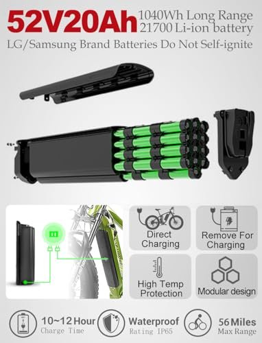 • 56miles Long Range. : – Ranger all terrain electric bikes features a 52V 20Ah removable battery and IP65 waterproof design, ensuring reliable performance in all weather conditions. The battery can be easily detached for convenient charging at the office or anywhere else, eliminating range anxiety. When fully charged, the pedal-assist mode offers a range of up to 56 miles, making it perfect for long-distance rides.
