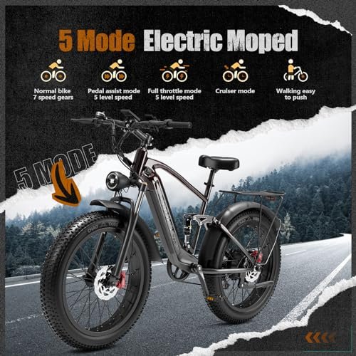 [5 Mode Electric Moped 1, ride it as a normal bike if the battery runs out, the 7-speed gears help riding more easier; 2, pedal assist mode, the battery gives plenty of power to assist to ride when you are pedaling; 3, full throttle mode, press the thumb throttle, the bike will auto move without pedaling; 4, cruiser mode, set a constant speed to cruising without pressing the throttle; 5, battery assist in pushing the bike, so that you can easy to walk away with the bike