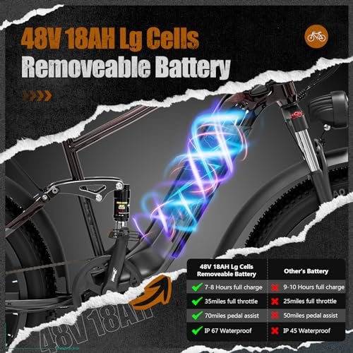 [ Electric Bike LG Cells Battery battery power bike is equipped with a 18Ah 48V LG Cells lithium-ion battery, which provides the bike with 35+ miles of throttle mileage. And the battery is lockable and removable and easy to carry to charge whether at home or work.