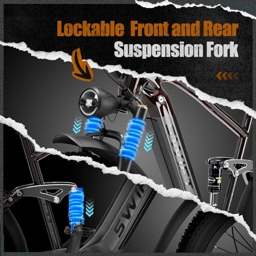 [Full Suspension Ebike Experience a smooth and comfortable ride with the Full Suspension Ebike’s lockable and adjustable front suspension fork, combined with a reliable rear shock absorber. Whether you’re navigating rough hills, bomby terrain, or city streets, this bike’s powerful suspension system is designed to ease bumps and provide maximum comfort, allowing you to ride for longer periods without feeling fatigued.