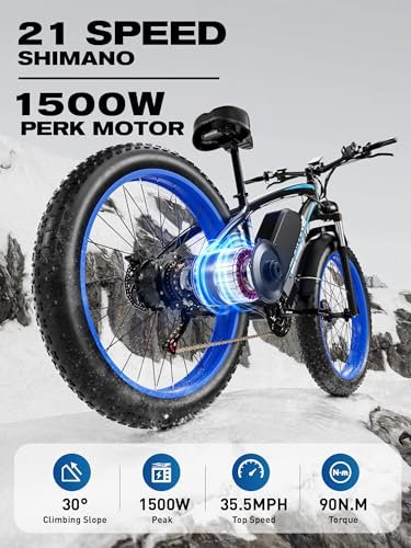 Electric Bike for Adults 1000W Peak 1500W Motor E Bike with 52V 19.2AH Battery 35.5MPH 21 Speed Ebike, 26″x4″ All Terrain Fat Tire Electric Bicycle with Front Fork Suspension