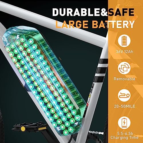• SUPER POWERFUL MOTOR AND LONG LIFE. : – 26 ” x 2.125 electric bicycle is equipped with 500W motor and built-in 12Ah removable battery; 26 ” x 3.0 electric bike is equipped with 750W motor and built-in 15Ah removable battery. 26 ” x 4.0 e bike is equipped with 750W motor and built-in 15Ah removable battery. It can easily climb a 25-degree slope. Depending on the mode, it can be used for 6-7 hours on a single charge.