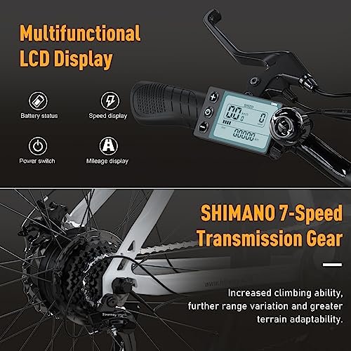 • ADVANCED DESIGN. : – HITWAY e bikes are made of carbon steel construction for high strength. An easy-to-read LCD display (showing battery level, mileage, speed, error codes, etc.), headlight and reflectors ensure your safety.
