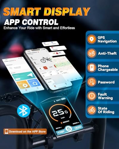 • Smart System. : – . : – Cell phone chargable. A full-color smart screen from this electric bike for adults can connect to mobile APP, GPS navigation, and anti-theft. The full-color screen helps to easily monitor important data such as battery power, driving distance, speed, and riding mode, giving you a smarter riding experience.