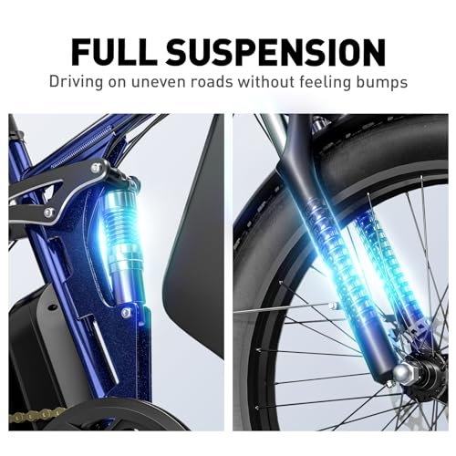 • Full Suspension & Dual Disc Brakes – With front and rear suspension, e bikes for adults electric provides exceptional shock absorption for tackling any terrain effortlessly and brings you a smoother and safer riding experience. And its dual disc brakes offer immediate and responsive power in any road condition, which ensures your safety when enjoying the speed.