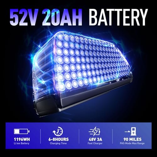 • 52V 20Ah Removable Battery & 90 Miles Long Distance – Equipped with 52V 20Ah large Li-ion battery, our electric bike ensures a longer ride time, providing up to 90 miles range per charge (PAS mode) and 35 miles in pure electric mode. The removable battery makes it easy to charge, whether your are at home or outside.
