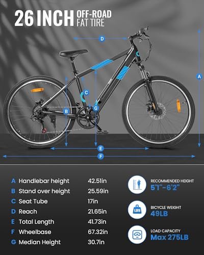 • Safe & Comfortable Riding. : – Our ebike features 26*1.95 inch Off-road tires with a professional Suspension Fork, providing a safe and smooth ride on various terrains like sand, mud, gravel, and snow. The front and rear disc brakes fully protect your safety.
