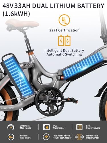Folding Electric Bike for Adults 1200W Peak Motor, 48V 29AH Battery 100 Miles Range, 28MPH 20″ Fat Tire Ebikes for Adults with APP, Full Suspension, Hydraulic Brake, UL 2849 Certified