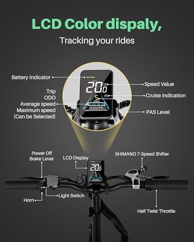 Personalized Cycling. : – . : – Ebike for adults equipped with an LCD, which enables you to track your riding data effortlessly such as current speed, single ride mileage, total ride mileage, etc. The bright headlight, tailight and flashable reflector provide more visibility in dark conditions, enabling you to see and be seen, and use electric horn to alert other pedestrians.