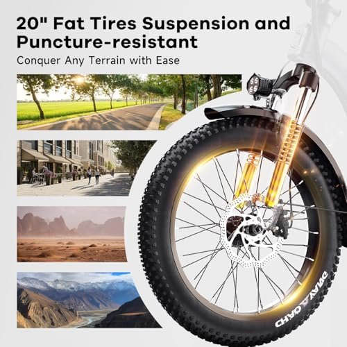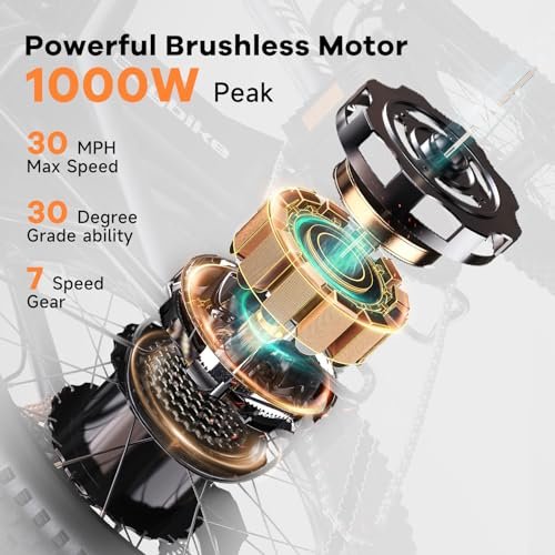 • Superior Front Suspension and Dual Disc Brakes. : – The ebikes for adults features Seat and Front Fork Dual Suspension, absorb any bumps or shocks encountered on the road, providing a smooth and comfortable ride. 180mm Dual Disc Brakes enables the ebike to stop quickly and smoothly, shortening the braking distance even on a wet road. In combination with 7-speed gear, discover more flexibility of quick climbing response and experience the ultimate electric mountain bike riding experience!