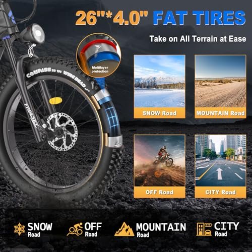 • 5 Riding Modes & 26″*4.0″ Fat Tire. : – Electric Mode; Pedal Assist Mode; Cruise Mode; Manual Mode; Walking Mode. Easily switch between modes to suit your needs and mood, ensuring a smooth journey every time. 800 lumens headlight, reflectors on spoke and horn design to ensuer your safety when cycling at night. 26″x 4″ fat tires bring more comfortable experience
