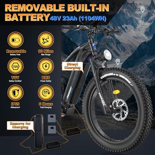 • 48V 23Ah Removable Battery & 90 Miles Max Range. : – Waterproof hidden battery design, 4-6 hours fast charging with 54.6V 3A charger. Which can achieve 45-90 miles’ mileage by pedal assist mode. (Note. : – the range varies according to road condition, riding mode, weather, rider’s weight etc.) UL2849-certified Battery
