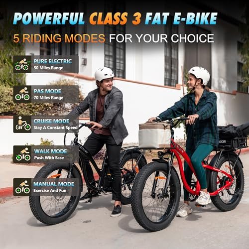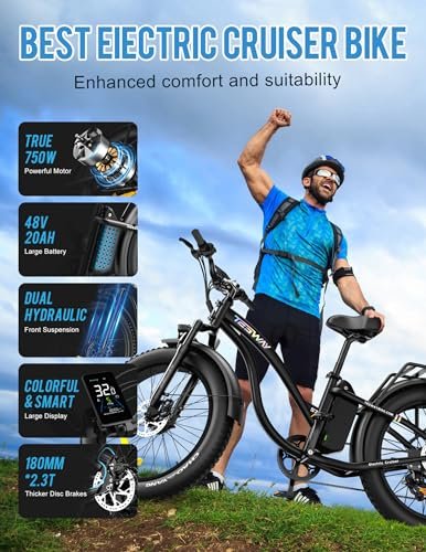 • CRUISER STYLE ELECTRIC BIKE. : – Our electric cruiser bike is carefully crafted to provide you with a cozy and enjoyable riding experience.①With its 50°adjustable handlebar stem, you can easily customize the bike to fit your specific posture.② Features 1.8mm*2.3T dependable brakes and dual hydraulic front suspension system for safety and comfort.③ Also features ergonomic extra wide shape and soft foam noseless padding.④ 26″x4.0″wide and sturdy tires provide excellent stability and cushioning.
