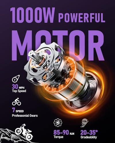 • ⚡Unleash Power and Speed⚡. : – . : – ①This adult electric bike is equipped with a powerful 1000W motor. ②The maximum speed of the bicycle in electric mode can reach 30MPH. ③The high-speed and powerful motor can continuously output 85 N.m, allowing riders to go uphill easily. With this electric bicycle, you can ride easily on various road conditions and reach your destination comfortably and safely!