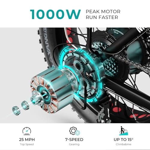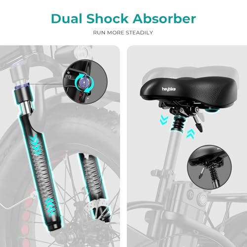 • 4″ FAT TIRES – With 4 inch wide puncture resistant fat tires and dual suspension. The places that Heybike Mars can take you are almost limitless. : – downtown around, rocky roads, sandy beaches, snowy suburbs, and even urban jungles.