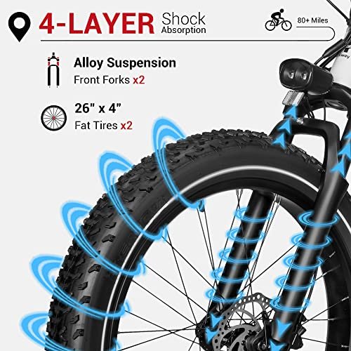• 26″X4″ Fat Tire Electric Bike. : – Mountain Ebikes & Town Travel & Daily Commute. Himiway ebike fat tire is great for mountains, city, sandy, snow. No more bumps in mountain roads because of 2 front suspension forks with superior shock removal.