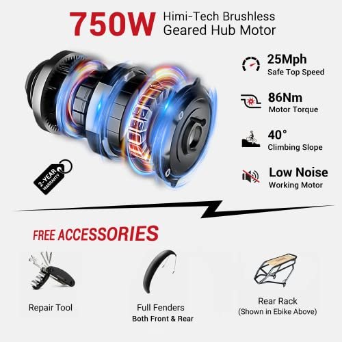 • Continuous 750W Electric Bike for Adults. : – Himiway 750W motor with 86Nm of torque, allowing riders easily winning 40° slopes. Under the power support of the Himi-tech 750W high-speed motor, the ebike provides you with a pure electric max speed of 25MPH.