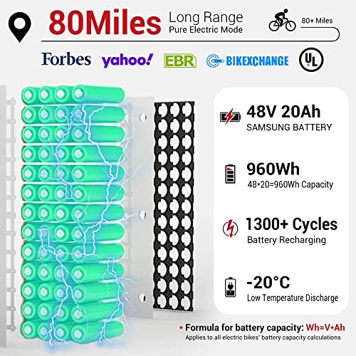 • 80Miles Long Range Electric Bikes. : – Himiway Zebra, the updated version of Himiway Cruiser, equips with Samsung/LG 48V 20Ah battery with a LARGE CAPACITY of 960Wh, allowing you to ride 60-80 miles WITH 3 RIDING MODES in pure electirc mode and 80+ miles in pedal assist mode. “Battery Never Run Out” is the top review by 100,000+ Himi Riders. ( Calculation formula for battery capacity. : – Wh=V*Ah. 960Wh=48V*20Ah. A larger Wh value can help you ride longer distances.)