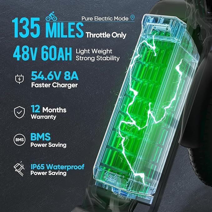• [60A REMOVABLE BATTERY SUPER LONG RANGE Electric Bike with our custom modular 48V 60Ah(2,880W) battery, Say goodbye to frequent charging. The Juliet allows riders to travel up to 135 miles per charge(only throttle).Only 6-8 hours charge time with the 8A super fast charger. Only one battery can fully meet all your expectations for distance.Go anywhere you want!