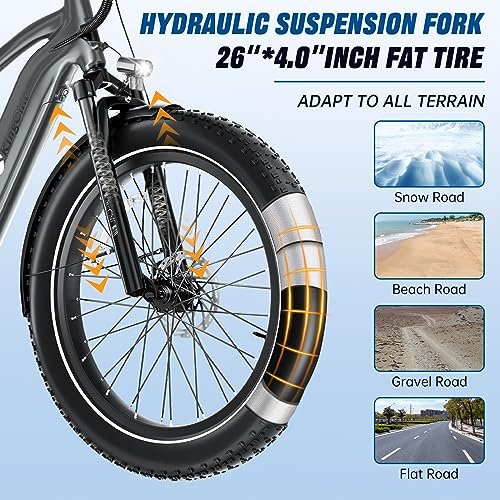 [RELIABLE RIDING SAFETY SYSTEM High-strength large hydraulic suspension front fork and 20″ / 26″*4.0″ CHAOYANG fat tires makes it easy for you to control off-road or terrain with huge drop. Dual hydraulic disc brakes system enable the ebike to stop quickly and smoothly even when riding at high speed. Shortening the braking distance even on wet road.The most stable triangular frame design ensures that the frame of the electric bike is not easily deformed when subjected.
