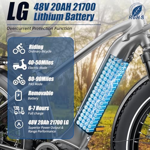 [LARGE CAPACITY LG LITHIUM BATTERY Our EBike is equipped with 48V/20Ah 21700 large capacity LG lithium battery, which provides 6 hours fast charge. The battery is removable,hidden, waterproof and convenient to bring home or office for charging.A single charge can last up to 50 Miles on pure electric power and 80-90 Miles with pedal assist.With the long-range option, you can enjoy extended rides without worrying about running out of power.