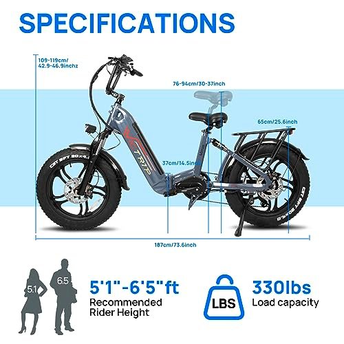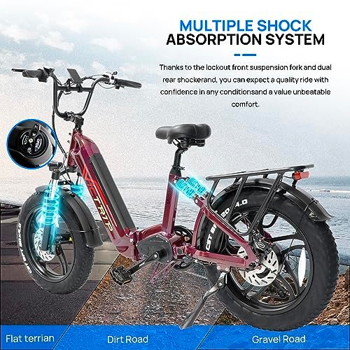 • PATENTED DESIGN. : – . : – The foldable design is easy to carry and space-saving, Its compact size makes it easy to store in your trunk, RV. enjoy the freedom to explore new places. The Step-Thru design is easy to get on and off for Riders of All Ages and Abilities! The professional design of the rear dual shock absorbers not only reduces the height of the seat so that more people can experience the fun of the dual shock absorbers. It also avoids the shock absorbers from pinching clothes when crossing.