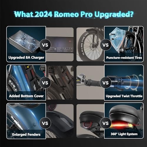 Upgraded 2024 Romeo Pro Electric Bike:①Upgraded electronic control system, ②Reinforced front fork,③Adjustable Rear Air Shock Absorber, ④4-piston hydraulic brake, ⑤add a cover plate on the bottom of the battery⑥Handlebar Riser⑦ Twist throttle⑧Wider Fender⑨Upgraded lighting system: headlight with switch function + taillight with brake light⑩Upgraded 8Ah charger