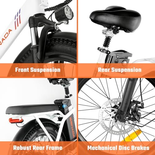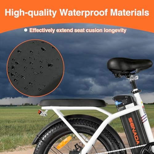 DUAL SUSPENSION WITH 3.0 FAT TIRES: The SENADA ebike with full suspension, one is located on the front fork and absorbs shock from the front wheel, while the seat suspension absorbs shock from the rear wheel. Combined with super-strong 3.0” professional fat tires are provide you with excellent traction.
