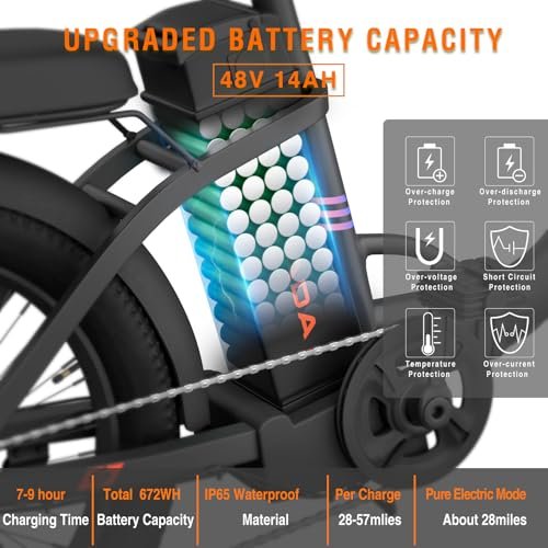 Specifications: Material: Aluminum Alloy Frame Battery: 48V 14Ah Lithium-ion Battery Range: 25~62 Miles Hub motor: Upgraded 1000W Rear Hub Motor Total Payload Capacity: 330 lb Recommended Rider Heights: 4’92″~6’23” (Please check the picture for more detailed information!) Charger: US Standard 2.0A Smart Charger Controller: 48v/28A, IP54 Display: 3.5″ LCD Display with USB Charging Port Weight with Battery: 76 lb Pedal Assist Intelligent: 0-5 Level Pedal Assist