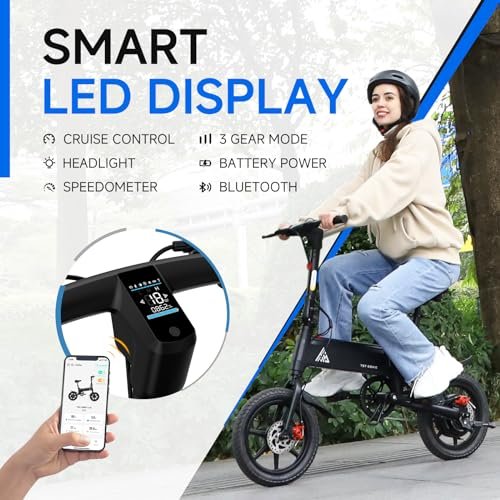 TST Folding Electric Bike, Electric Bicycle 18MPH, 500W Peak Motor, Max 18 Miles Range, 14″ Pneumatic Tires, Ebike with Smart LED Screen, App Control, 3 Speed Gear, E Bike for Adults and Teens