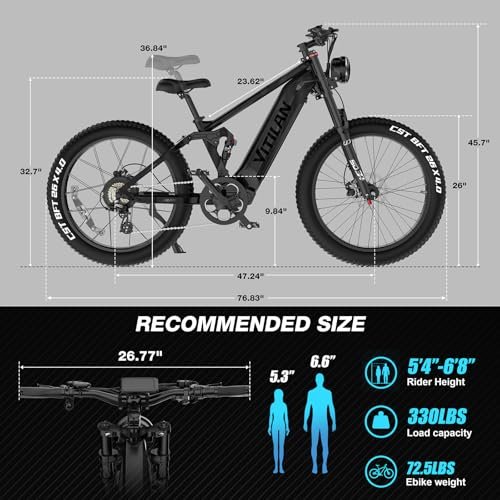 VITILAN T7 PRO 1600W Peak Electric Bike for Adults Fat Tire Ebike, 52V 20AH Removable Battery Max Range 80Miles & 35MPH, 26 Inch Mountain Electric Bicycle with Full Suspension